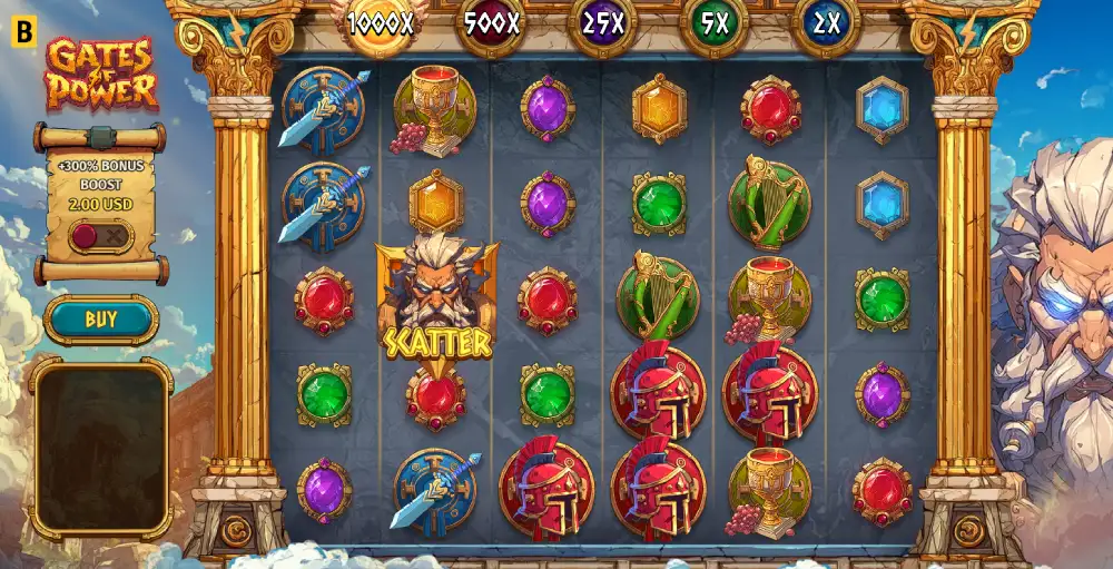 Gates Of Power runs on a 6×5 pay-anywhere grid where wins start at 8 symbols, triggering cascading tumbles. Multiplier symbols above the reels activate during wins, stacking potential for explosive chains. The gameplay loop is fast and designed to build momentum through consecutive tumbles.